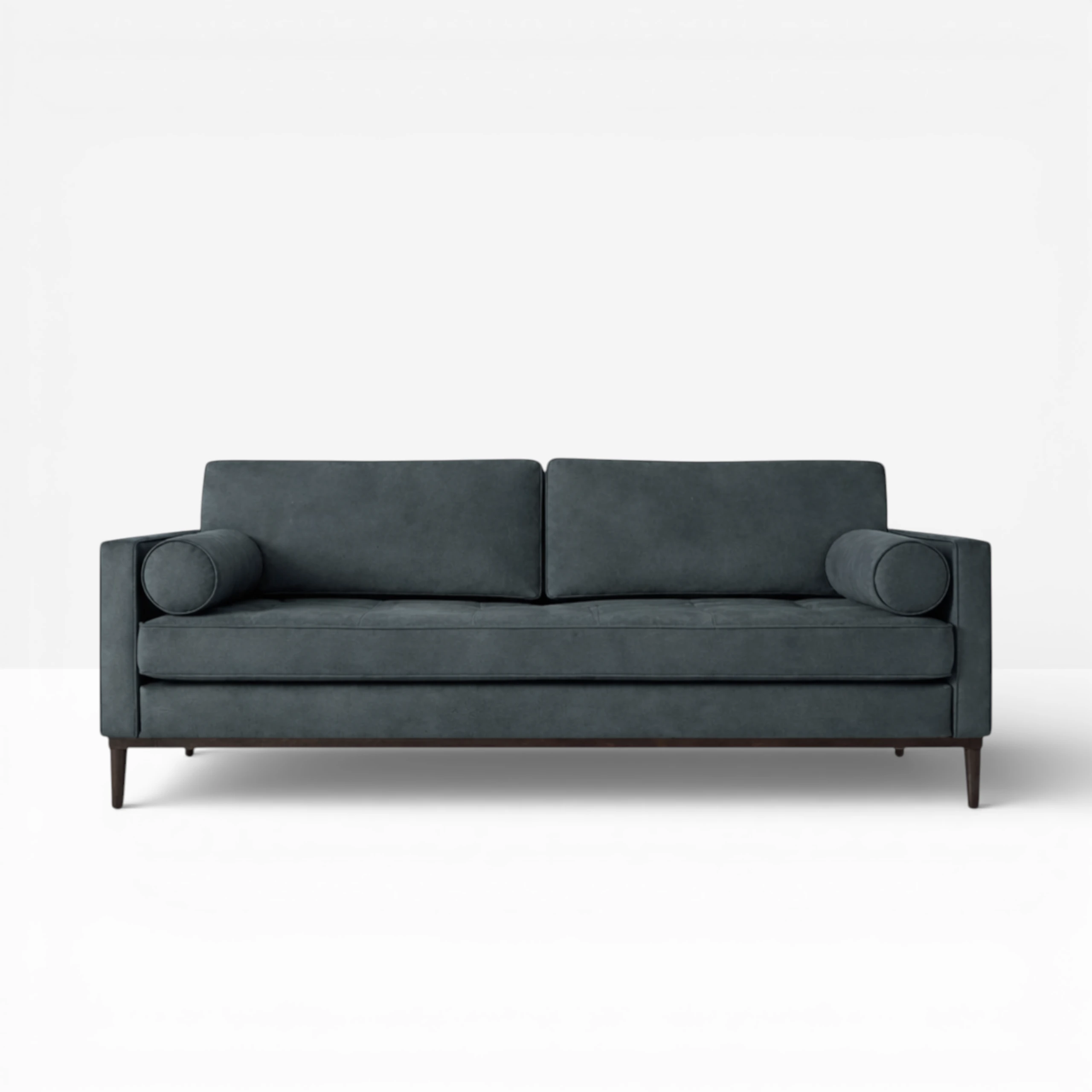Featuring solid wood legs. Seat height is 440mm and is available in other colours. The Velvet Charcoal sofa also comes with rounded bolster cushions.