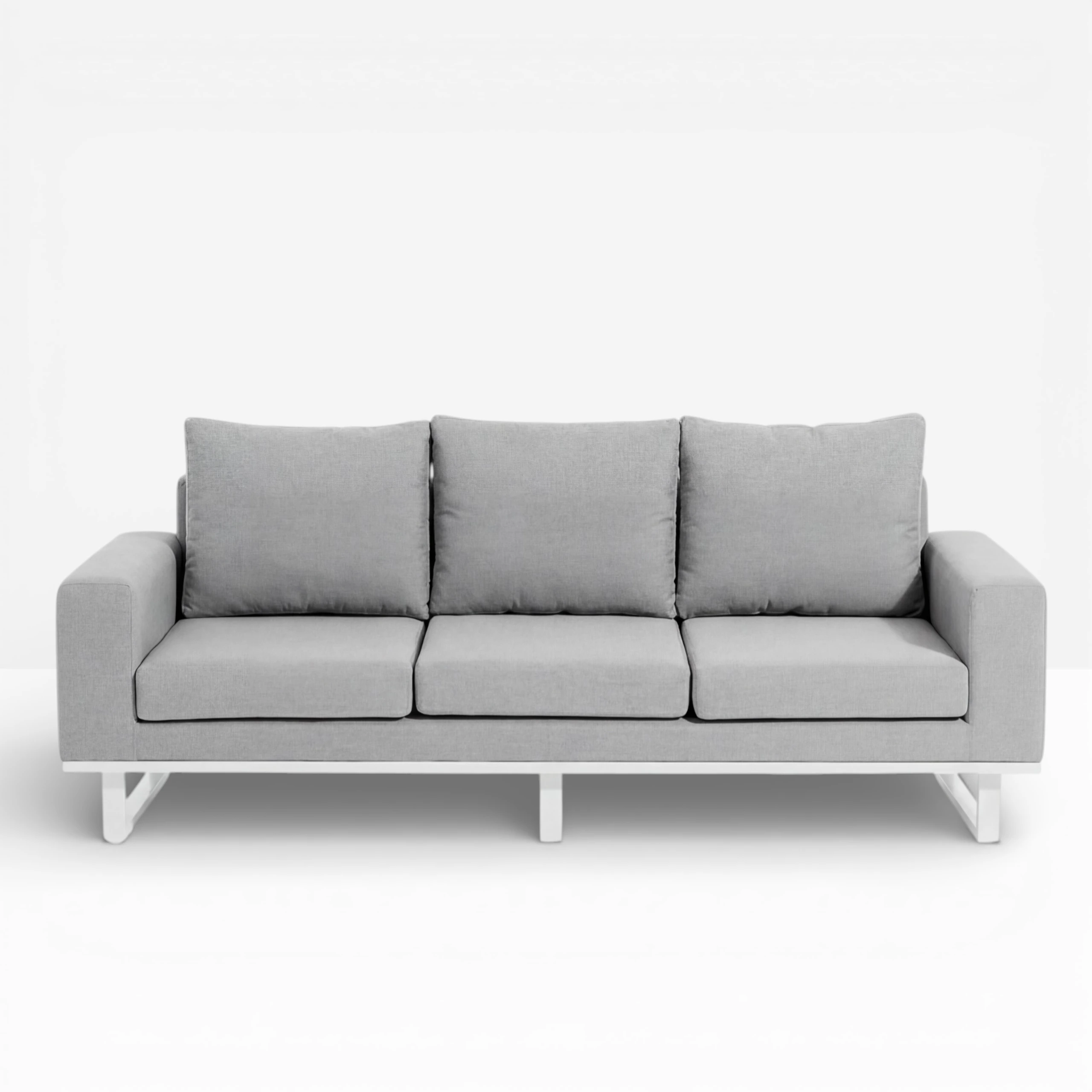 This three-seater sofa is part of our beautiful Ethos outdoor set. Featuring bold lines, deep-filled cushions and a contemporary design, the Ethos outdoor sofa is designed in an all-weather, light grey fabric with white legs.