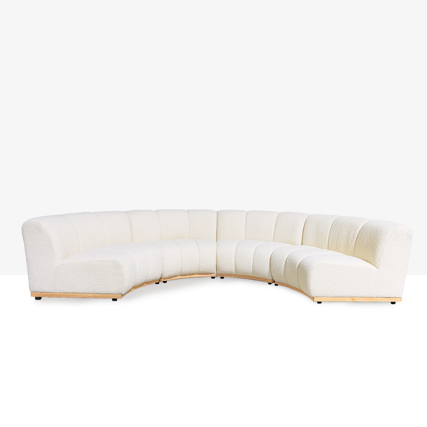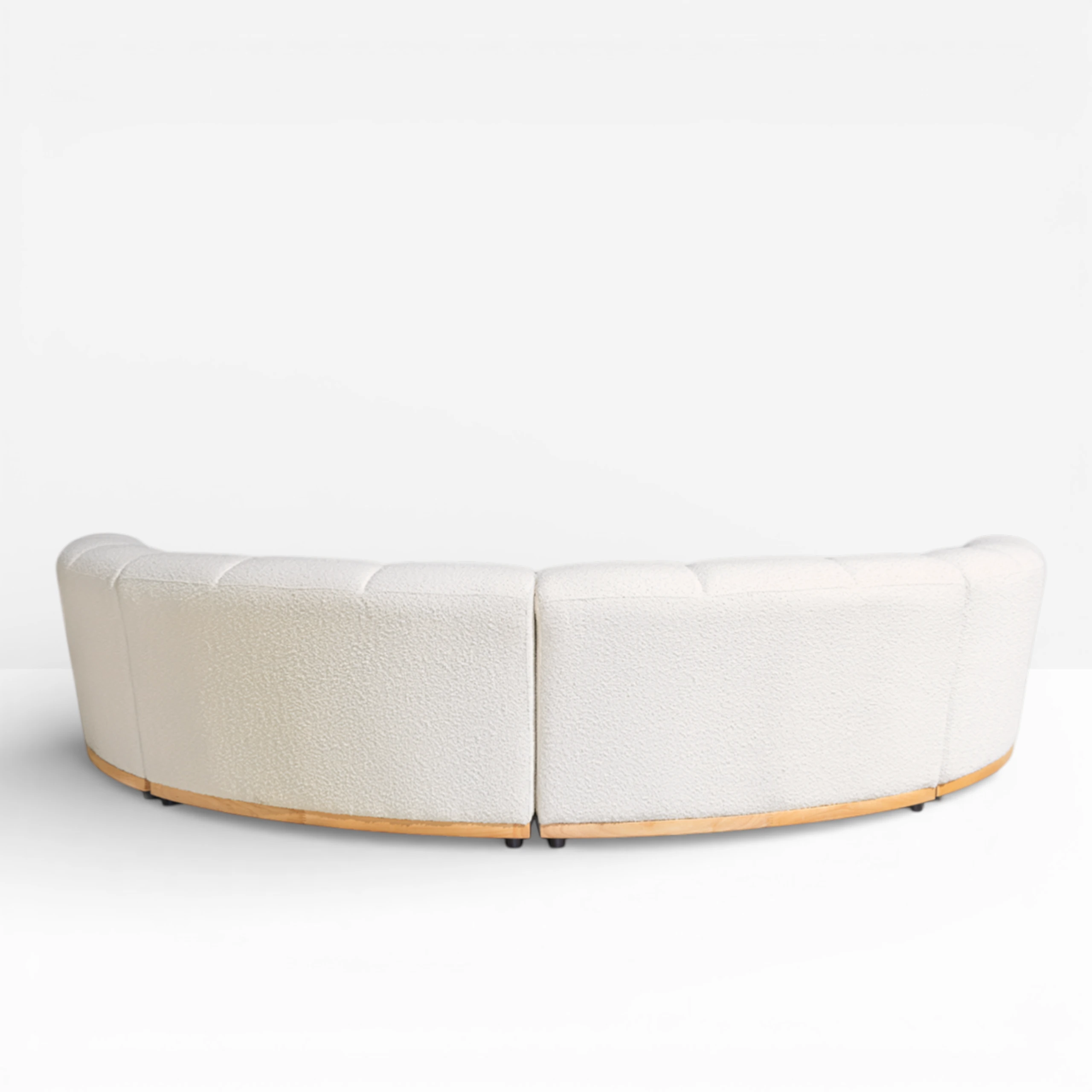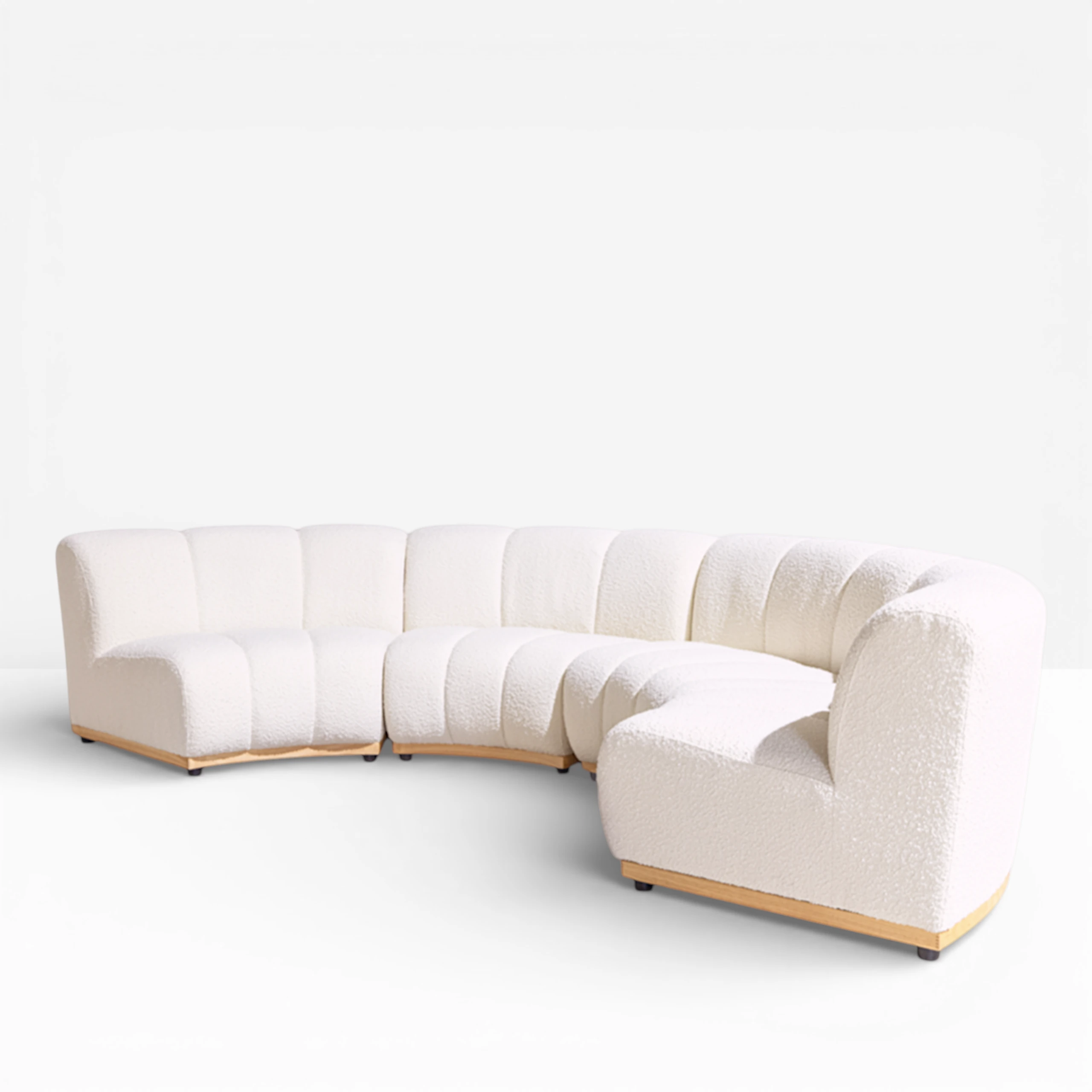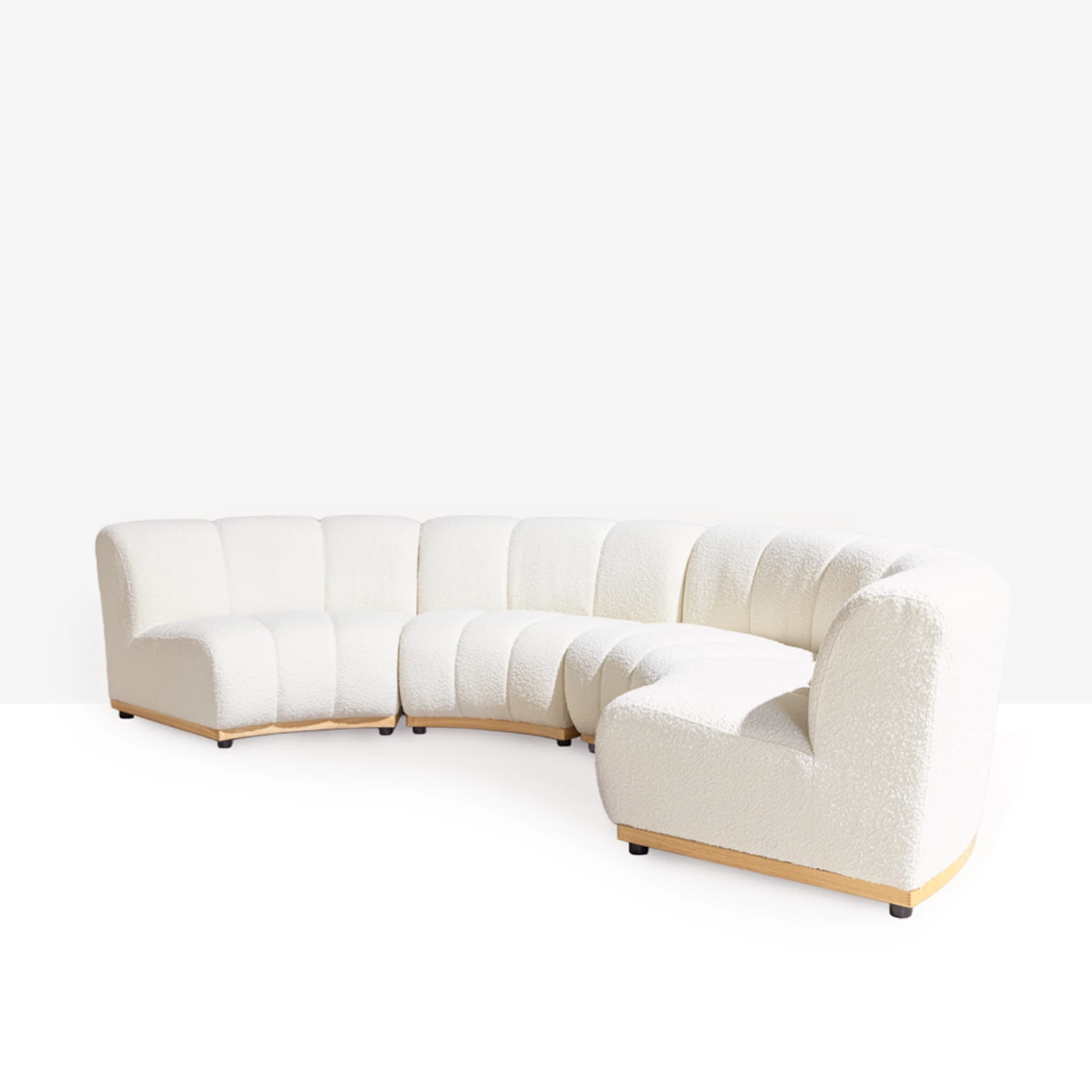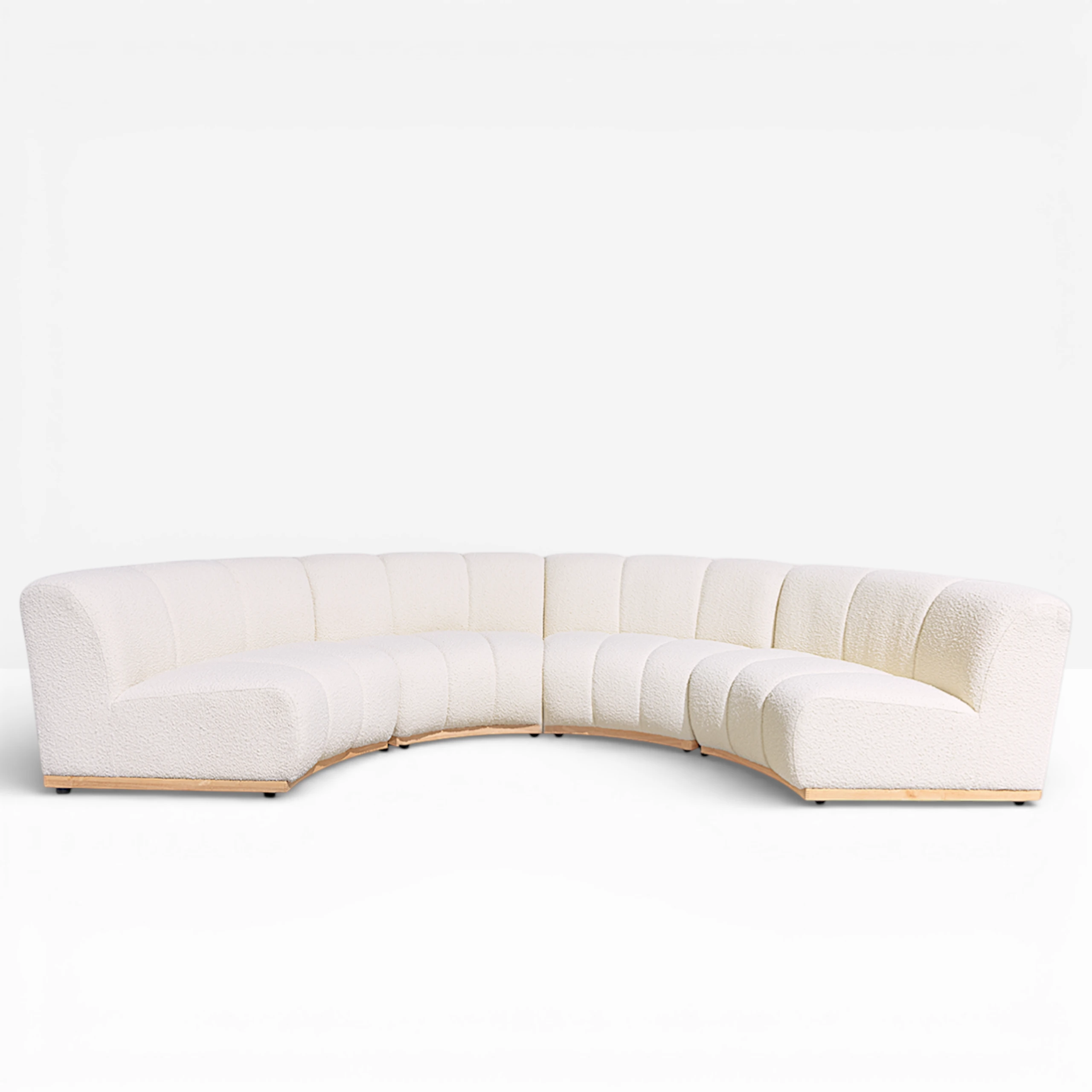 The Forma sofa is a 4-seater half circle curved sofa in a beautiful boucle cream fabric. Modular in design, the Forma can be also used as a 3 seater sofa, 2 seater sofa or as 3 singular seats. With a natural solid wooden base, the Forma sofa is a Scandinavian style.
