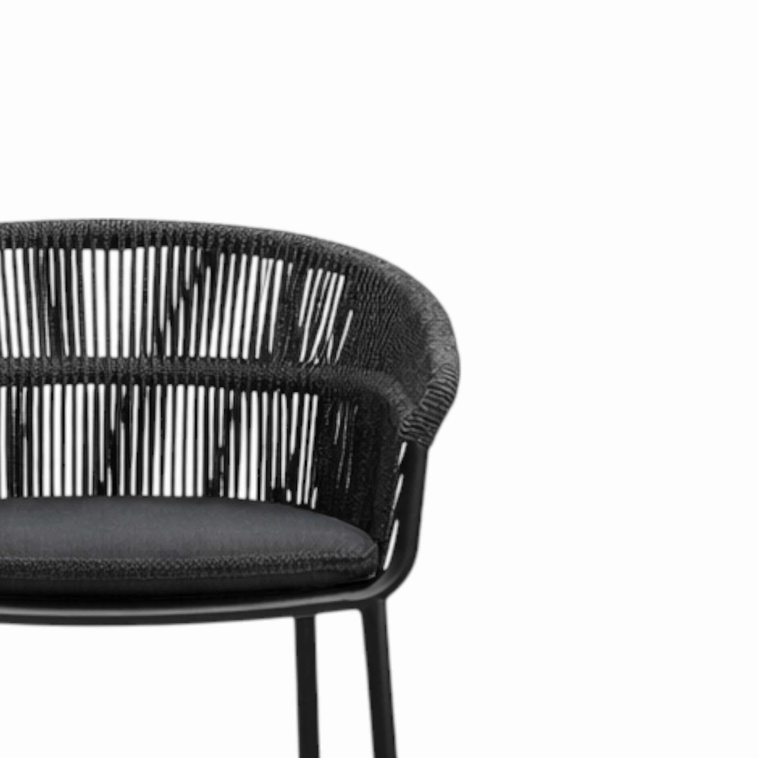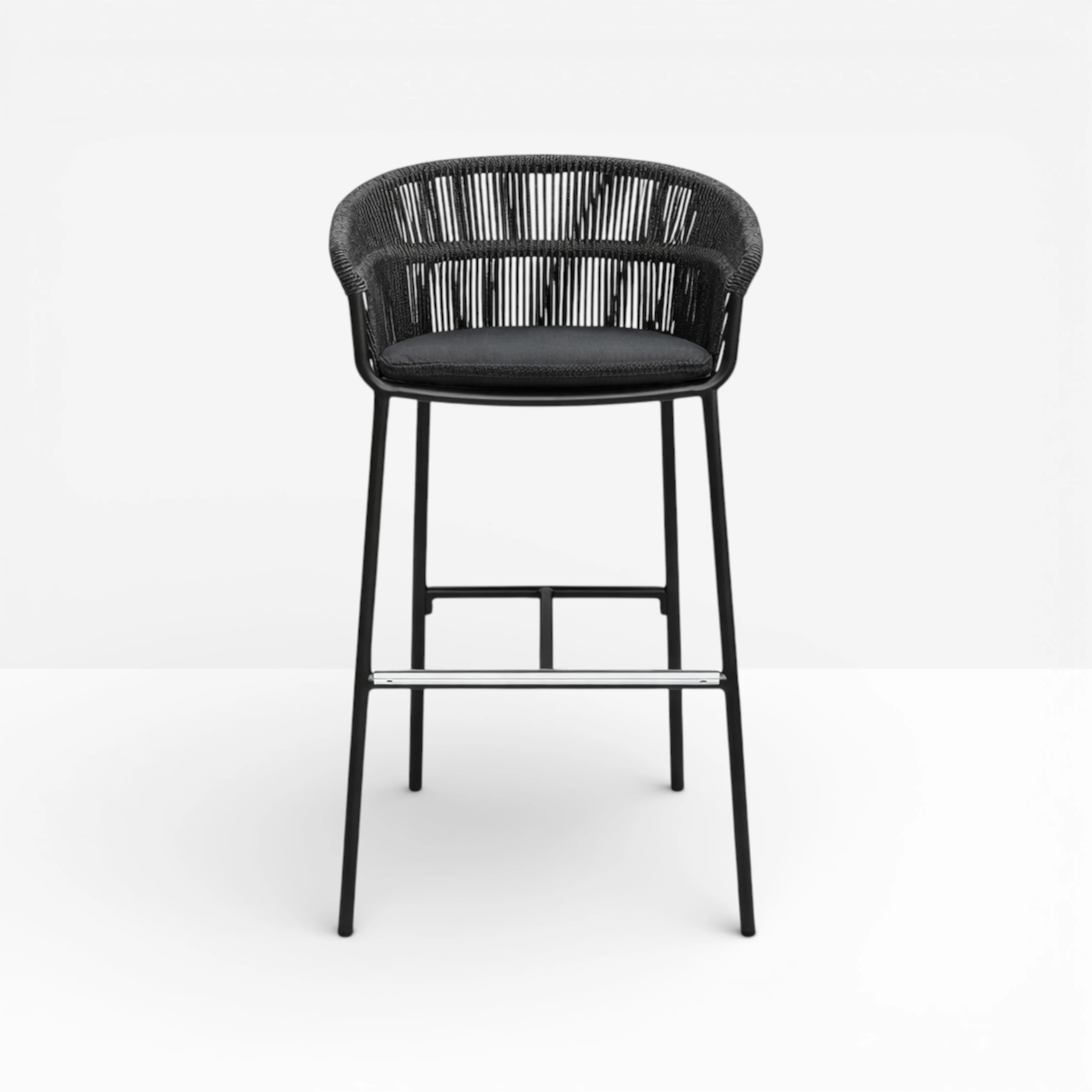 The Tessuto Stool is ideal for outdoor events with a woven exterior and cushioned seat. Designed for outdoor or indoor use, the Tessuto Stool features a footrest and all black frame perfect to pair with an outdoor poseur or bar space.