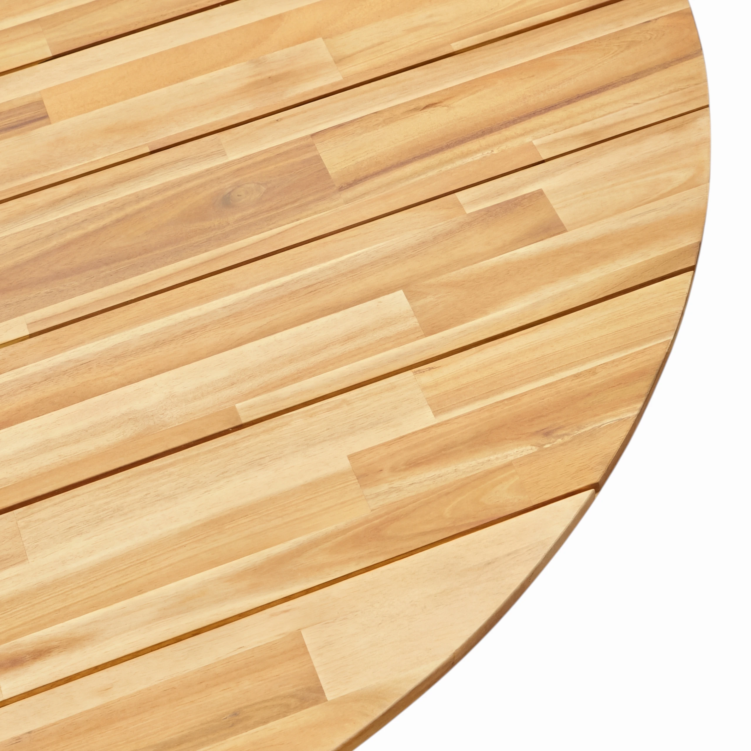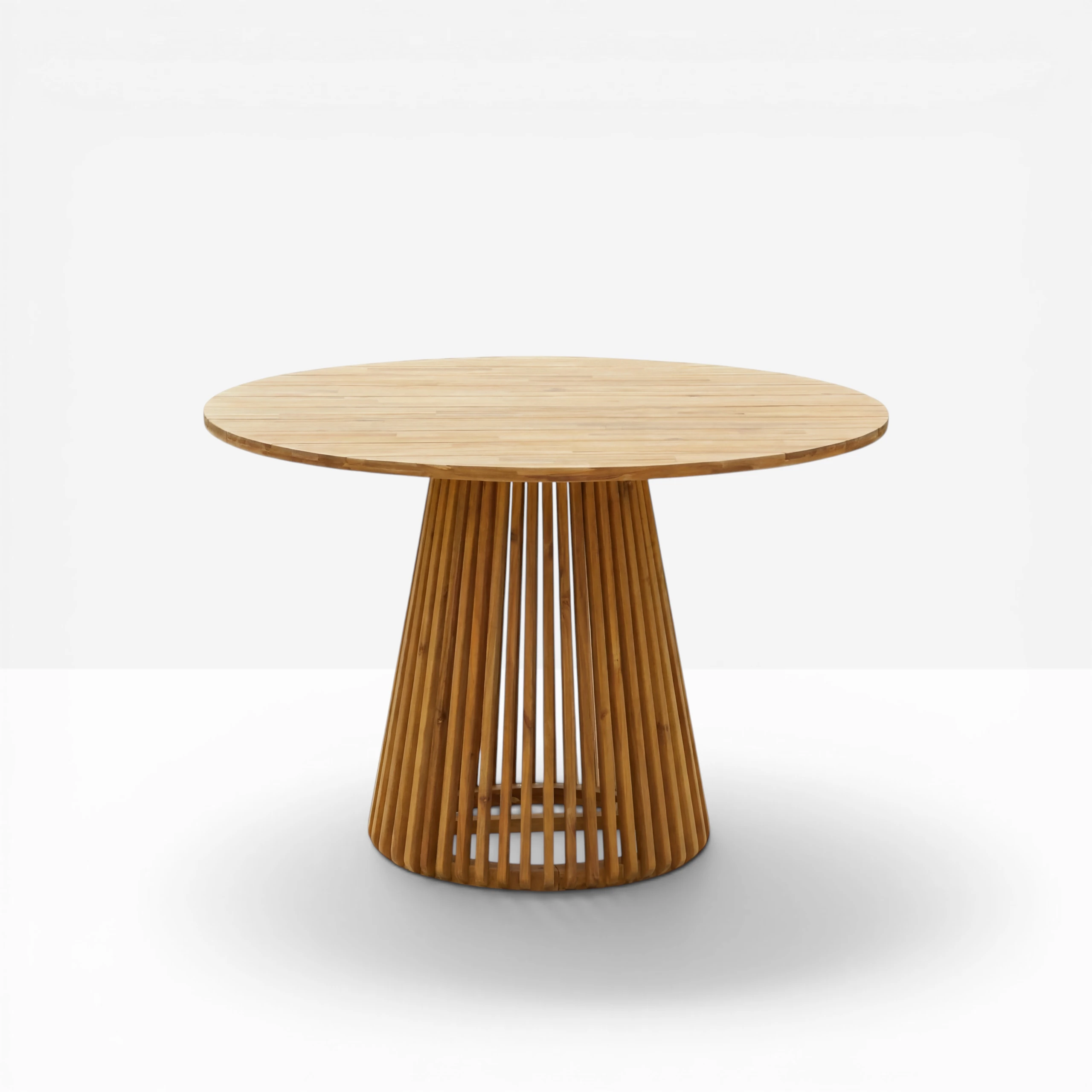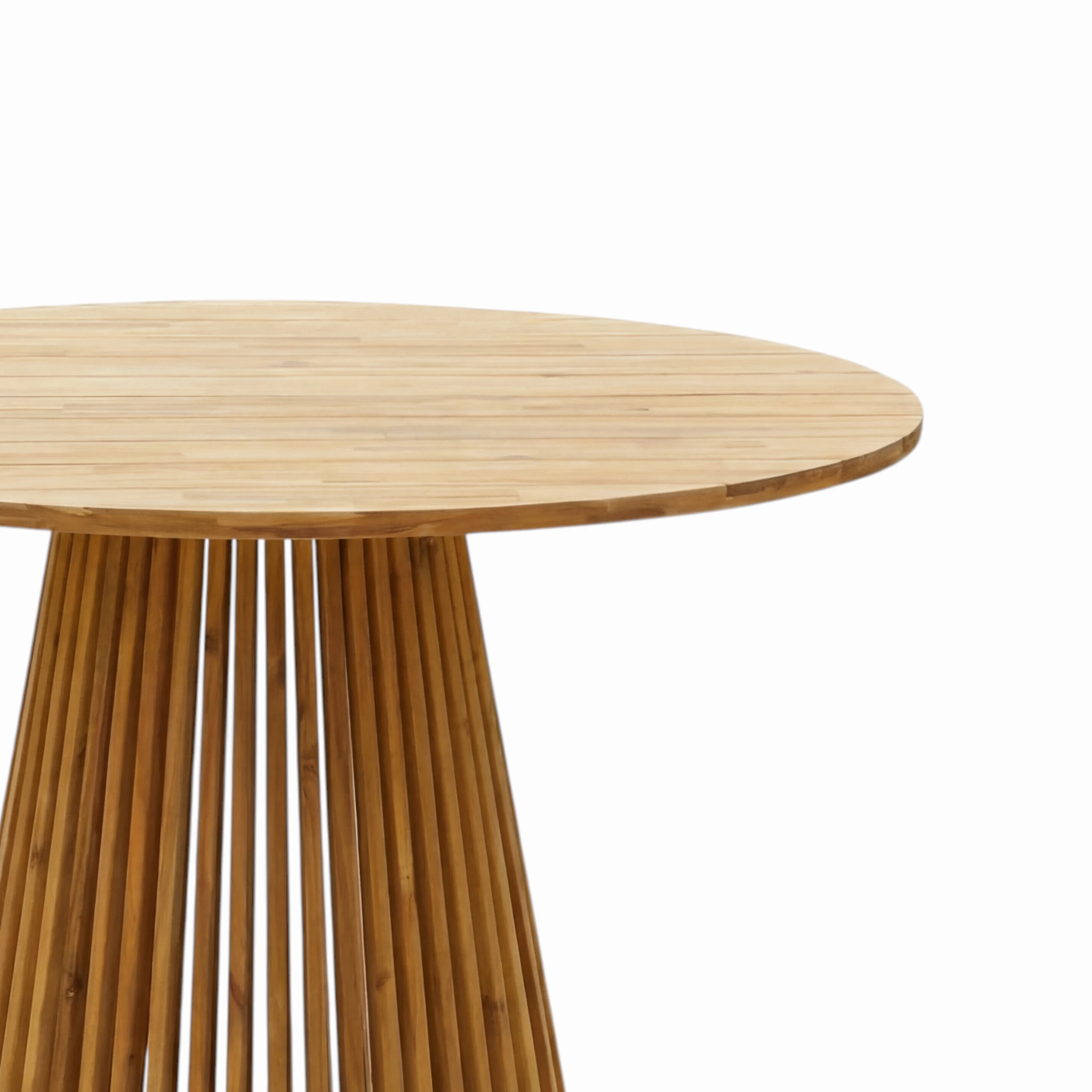 The Ventaglio Outdoor Dining Table features a round top in natural acacia wood with a slatted pedestal base. Its clean form and durable construction make it ideal for outdoor dining, terraces, and event spaces.